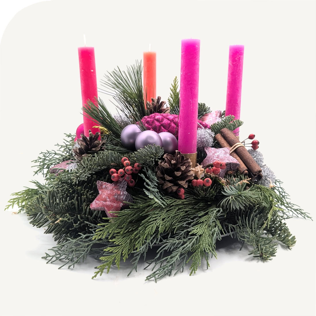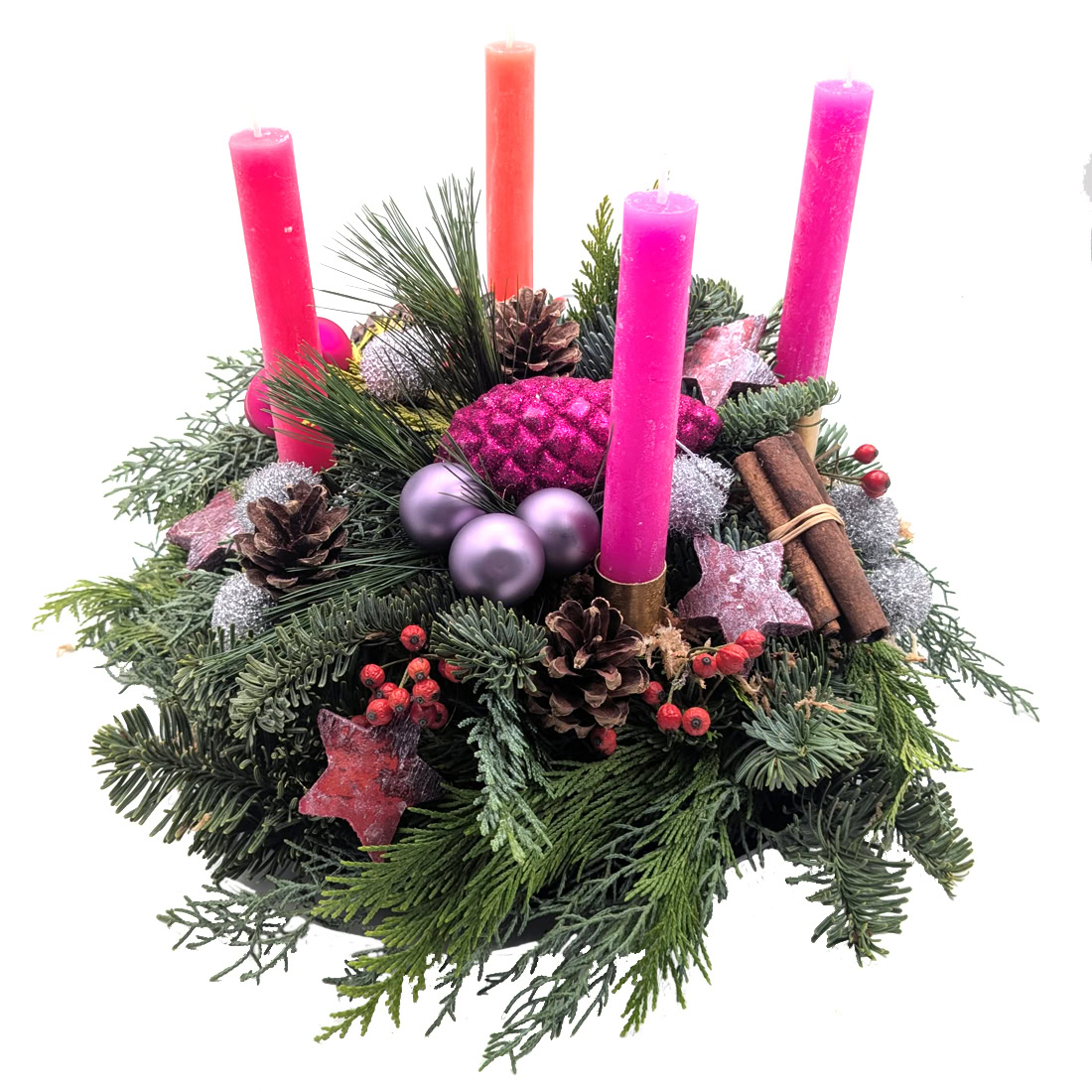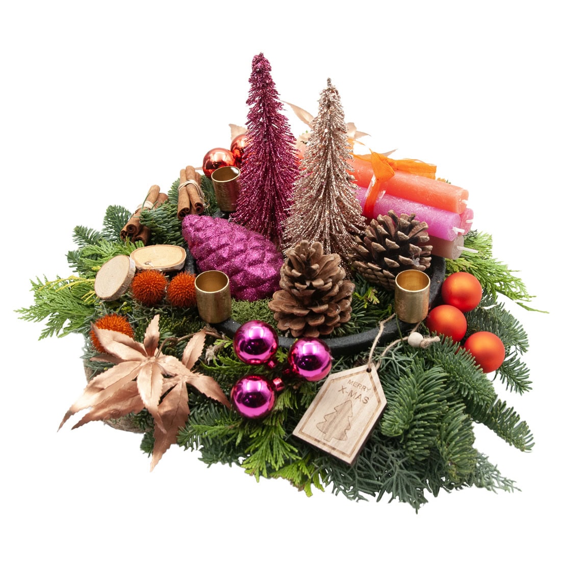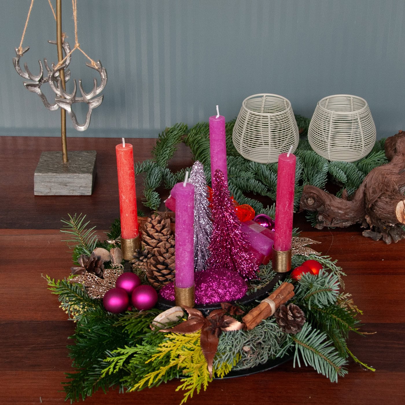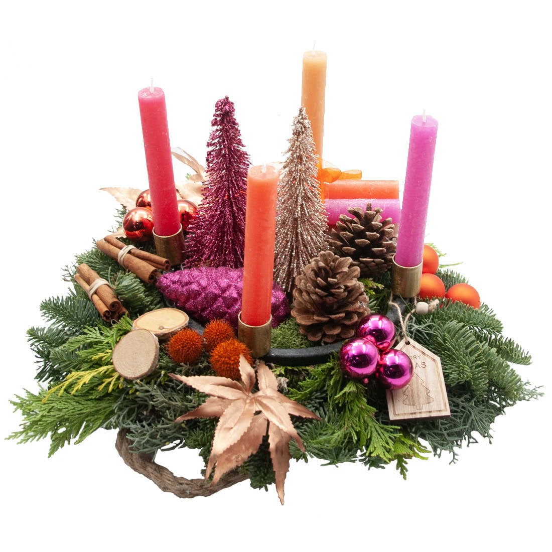 Add some color kerststuk met kaarsjes, fuchsia roze en oranje. De trendy kleuren van deze kerst. Geleverd met 4 kaarsjes