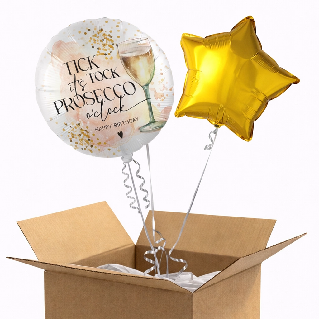 Ballon duo its prosecco o clock. Twee heliumballonen van circa 45cm. Een ballon uit een doos, altijd een leuke zwevende verrassing!