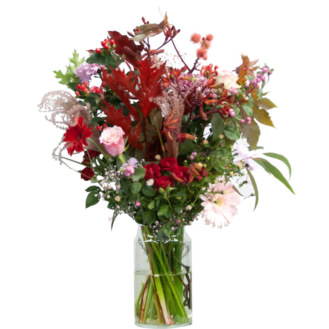 Bloemrijk najaar, boeket van het seizoen in een mooie kleuren combinatie van roze, rode tinten een prachtige combinatie van echte najaarsbloemen.