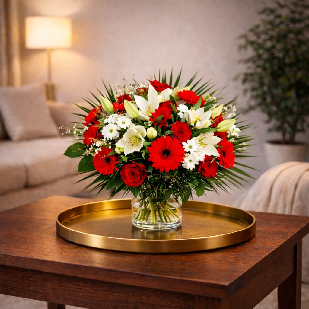 Boeket extra luxe. Breng de magie van Kerst tot leven met dit stijlvolle Rood-Wit Kerstboeket! Een prachtig arrangement met rode rozen, witte lelies, gerbera’s en seizoensgroen vol warmte, frisheid en elegantie. Altijd dagverse bloemen van de veiling, gebonden door onze bloembinders.