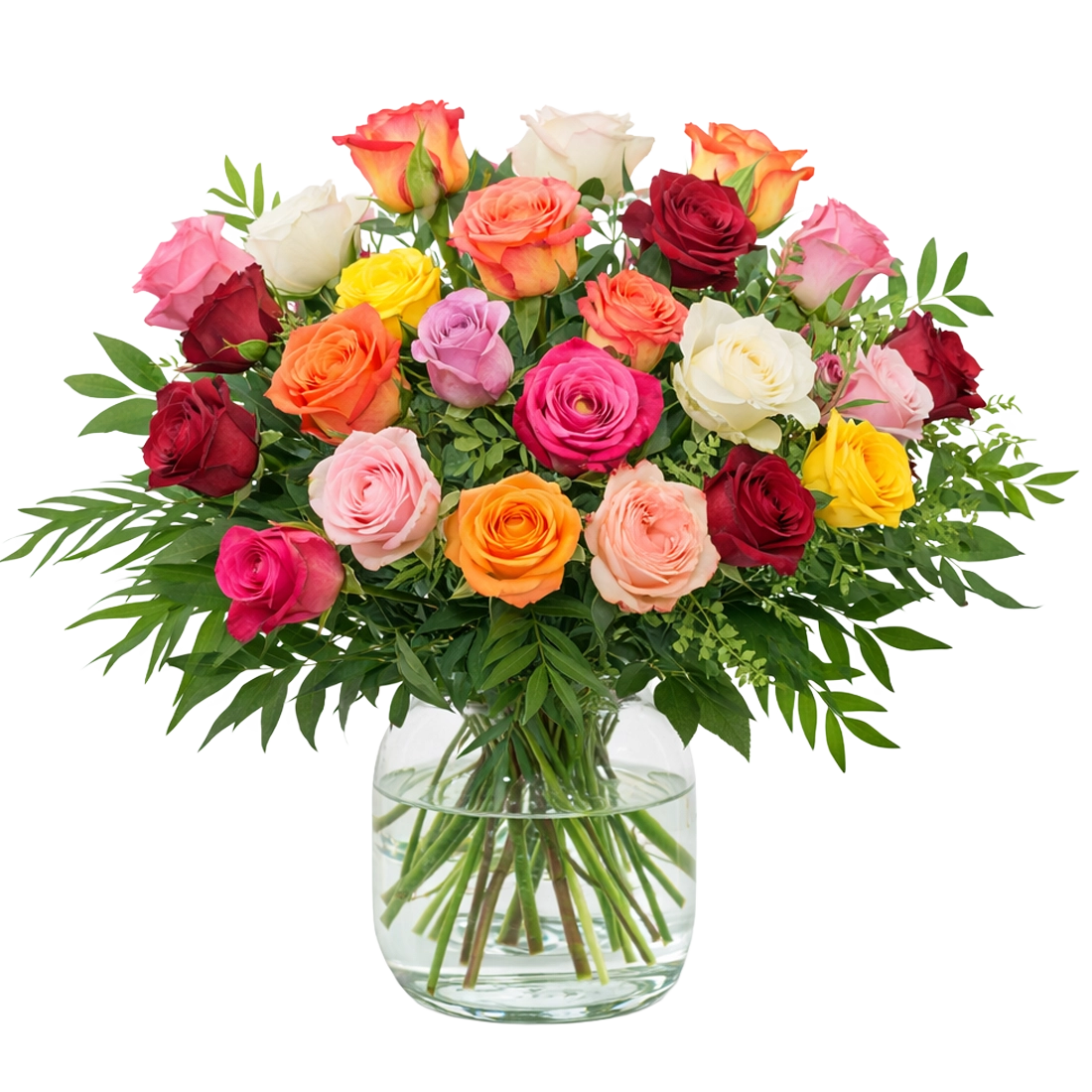 Boeket gemengde rozen kleurrijke boeket in verschillende kleuren gemengd met diverse soorten groen.