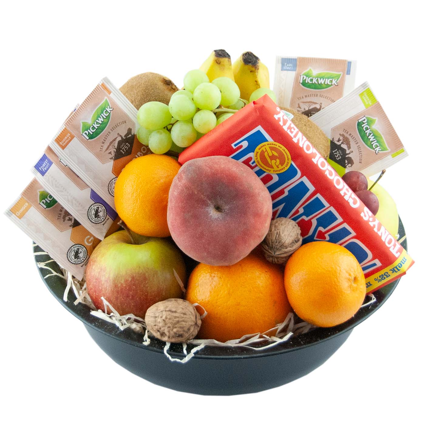 Fruitmand 30cm seizoensfruit thee en grote Tony’s chocolonely reep 180 gram. Rijk gevuld met heerlijk gemengd seizoensfruit.