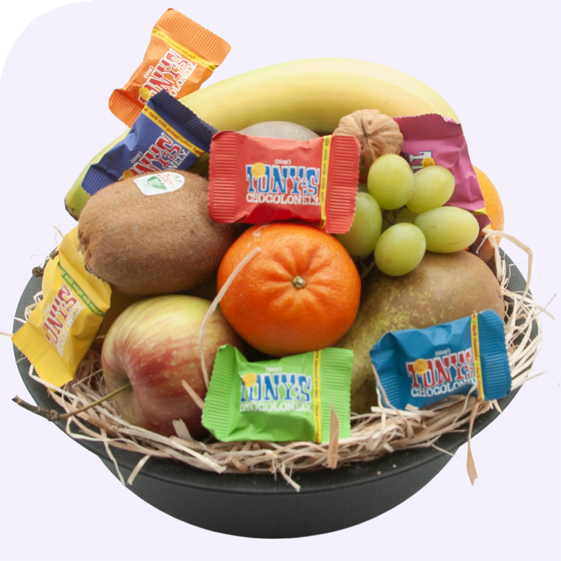 Fruitmand Tony Chocolonely, onze fruitmanden worden samengesteld door de onze fruit specialist vlak voordat wij ze verzenden naar de ontvanger.