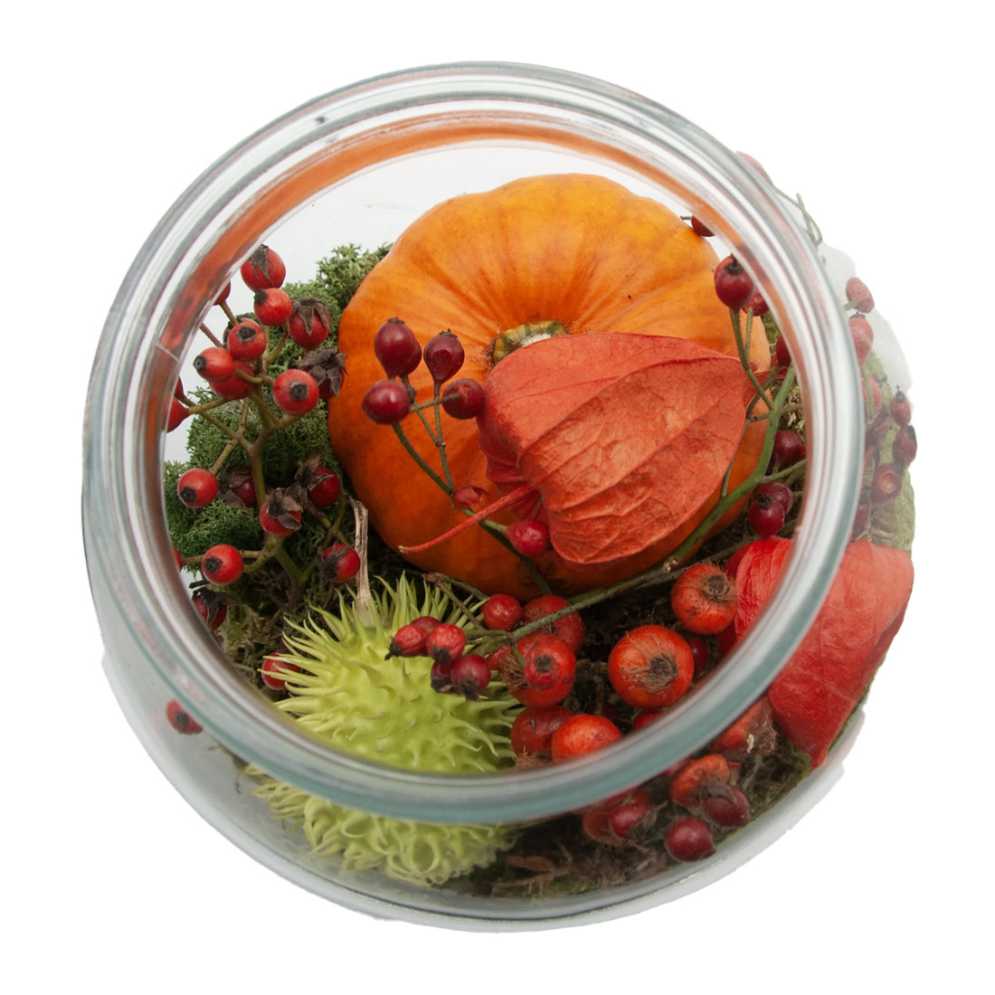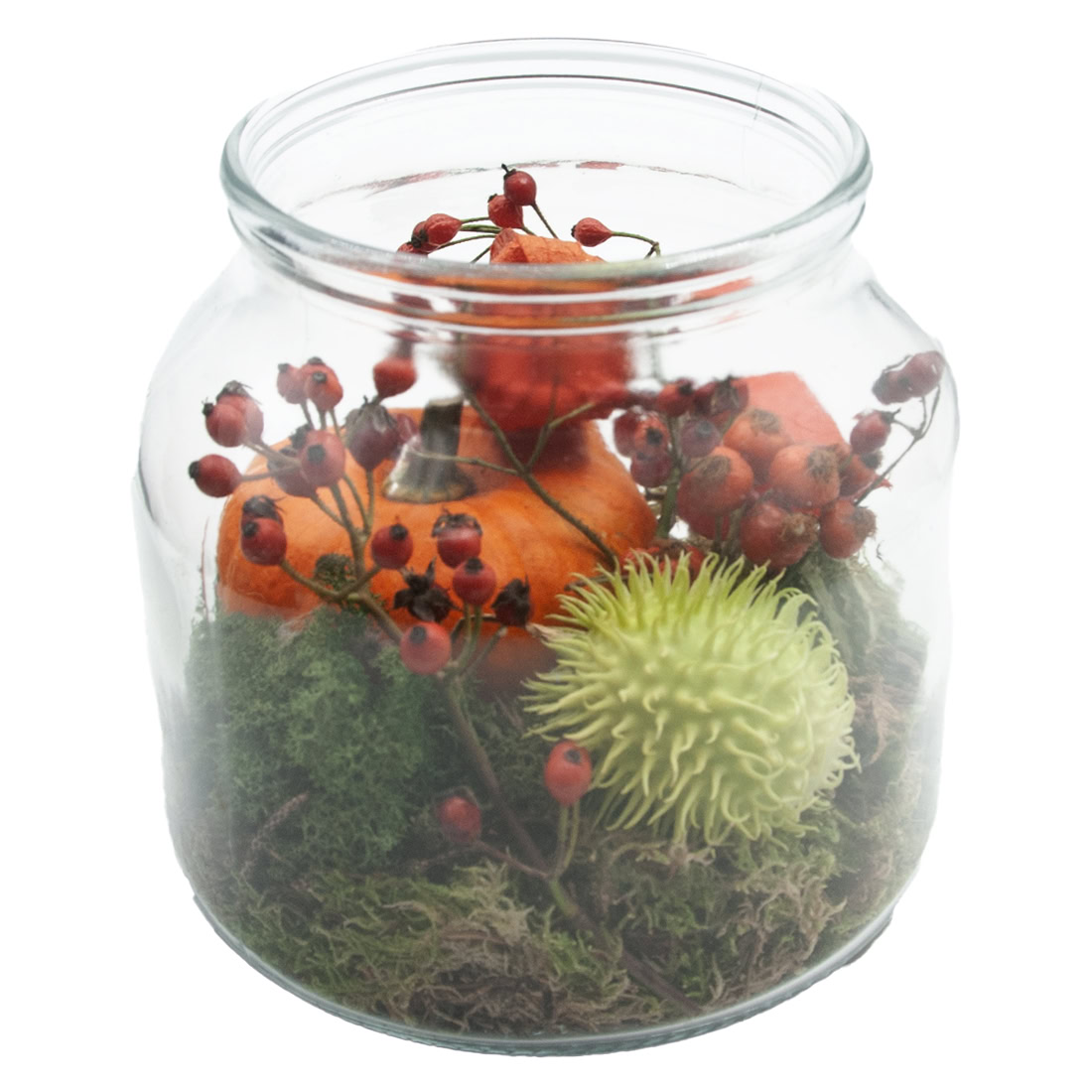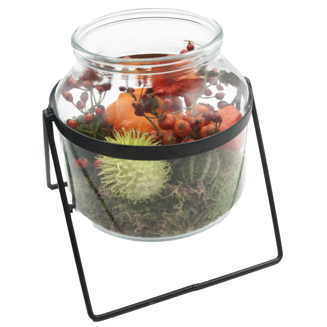 Breng direct warmte en gezelligheid in huis met deze Herfstdecoratie in glazen vaas. Een compact maar stijlvol arrangement gevuld met mos, sierbesjes, gedroogde herfstelementen en een decoratieve pompoentje perfect voor op tafel, in de hal of als cadeautje.