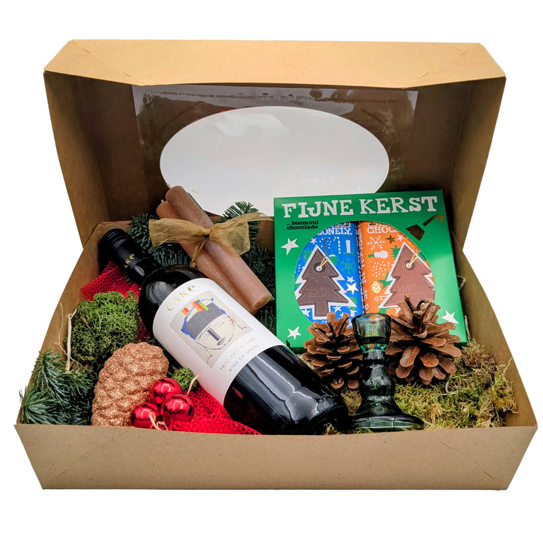 Kerstbox met rode wijn en tonys chocolonely. Verras iemand met deze luxe kerstbox boordevol sfeer en heerlijke traktaties. Gezellige decoraties zoals dennenappels, kaarsen en kerstgroen. Een prachtig samengesteld cadeau dat direct een warme kerstsfeer in huis brengt.