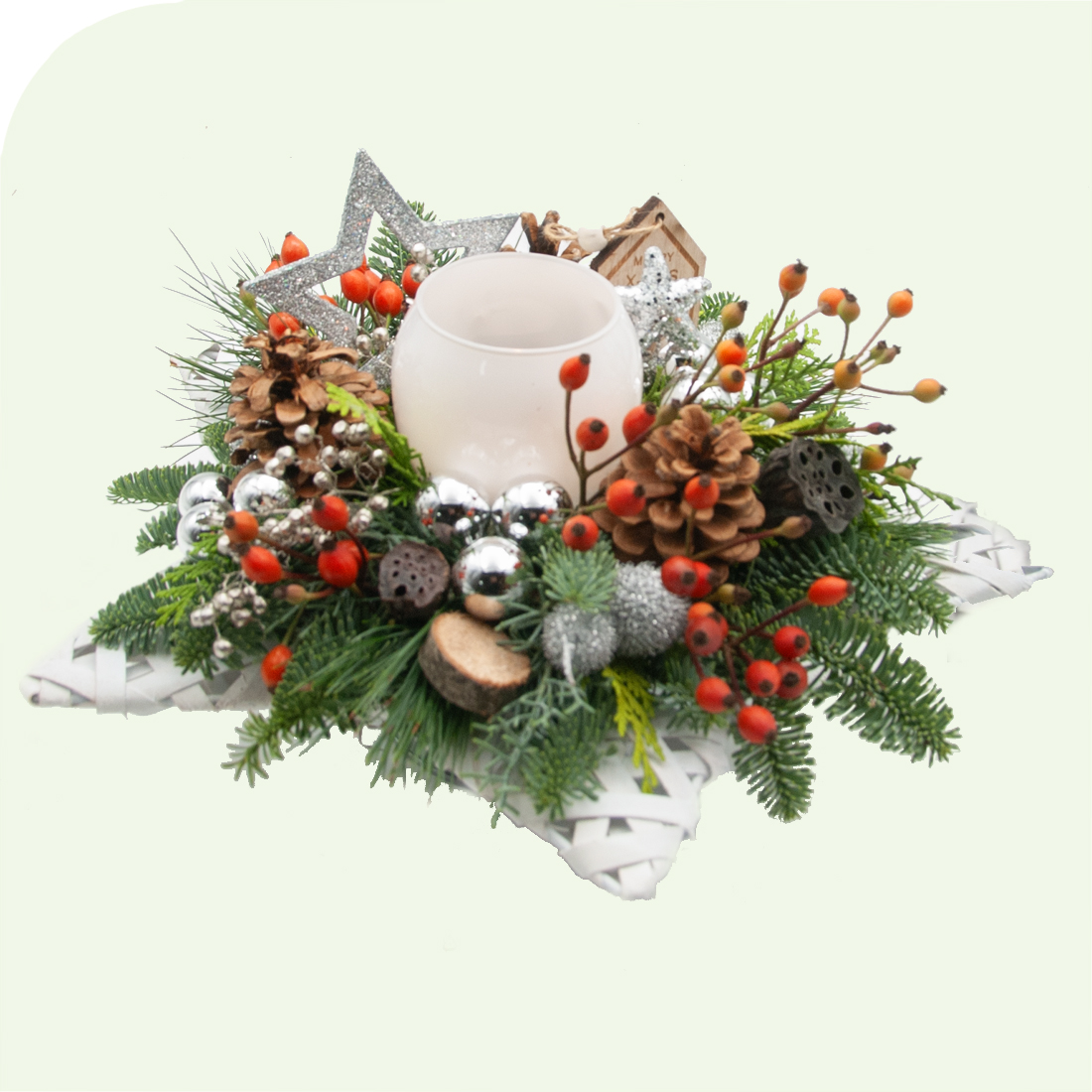 Kerststukje zilver. Breng een chique winterse sfeer in huis met dit stijlvolle Kerststukje Zilveren Sterren. Een elegant kerststukje met natuurlijke materialen, dennenappels, zilveren accenten en een sfeervolle lichtje perfect voor op tafel, het dressoir of als luxe kerstcadeau.