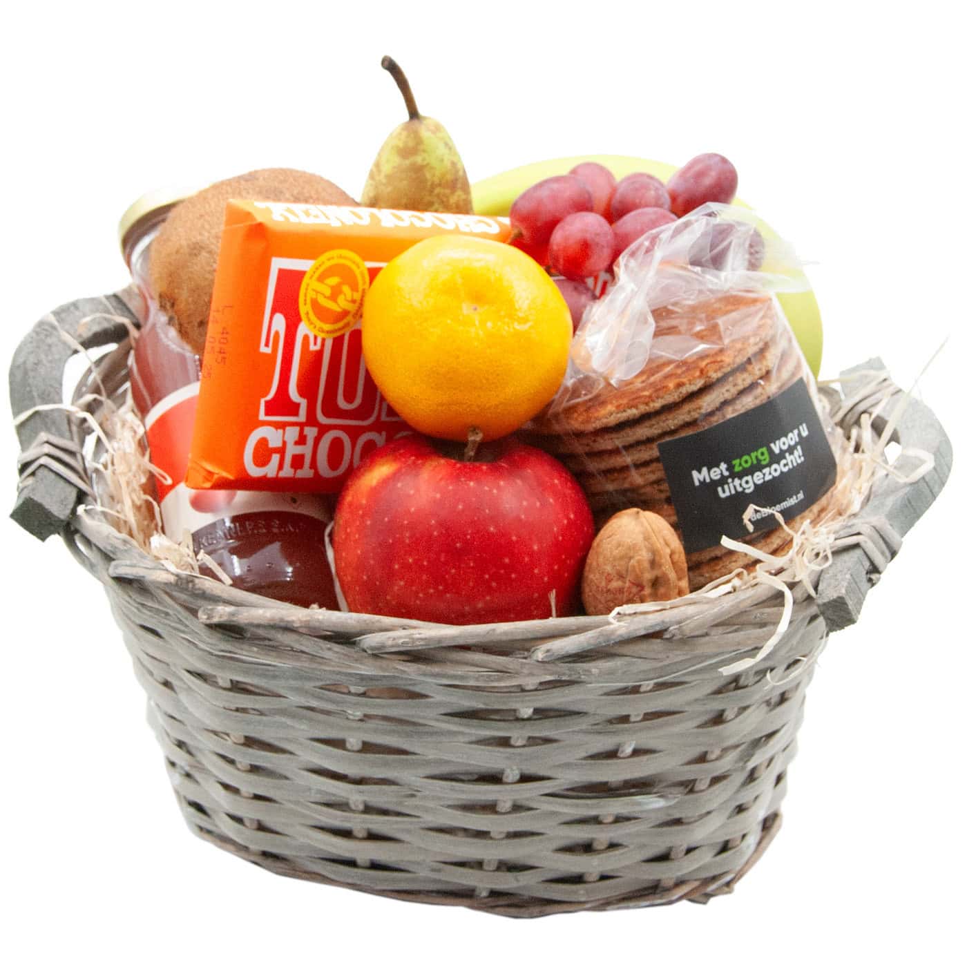Kleine lekkernij, mandje met fruit en lekkernijen. Naast een paar stuks fruit zit er in dit mandje ook een pakje stroopwafels, een grote reep Tony Chocolonely chocolade en een klein flesje vruchtensap. Altijd heerlijk vers fruit met zorg voor u uitgezocht!