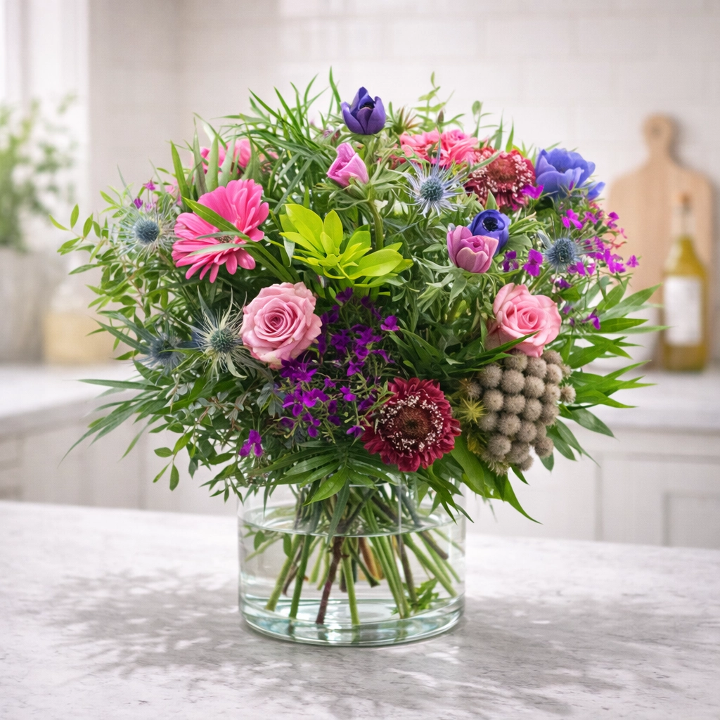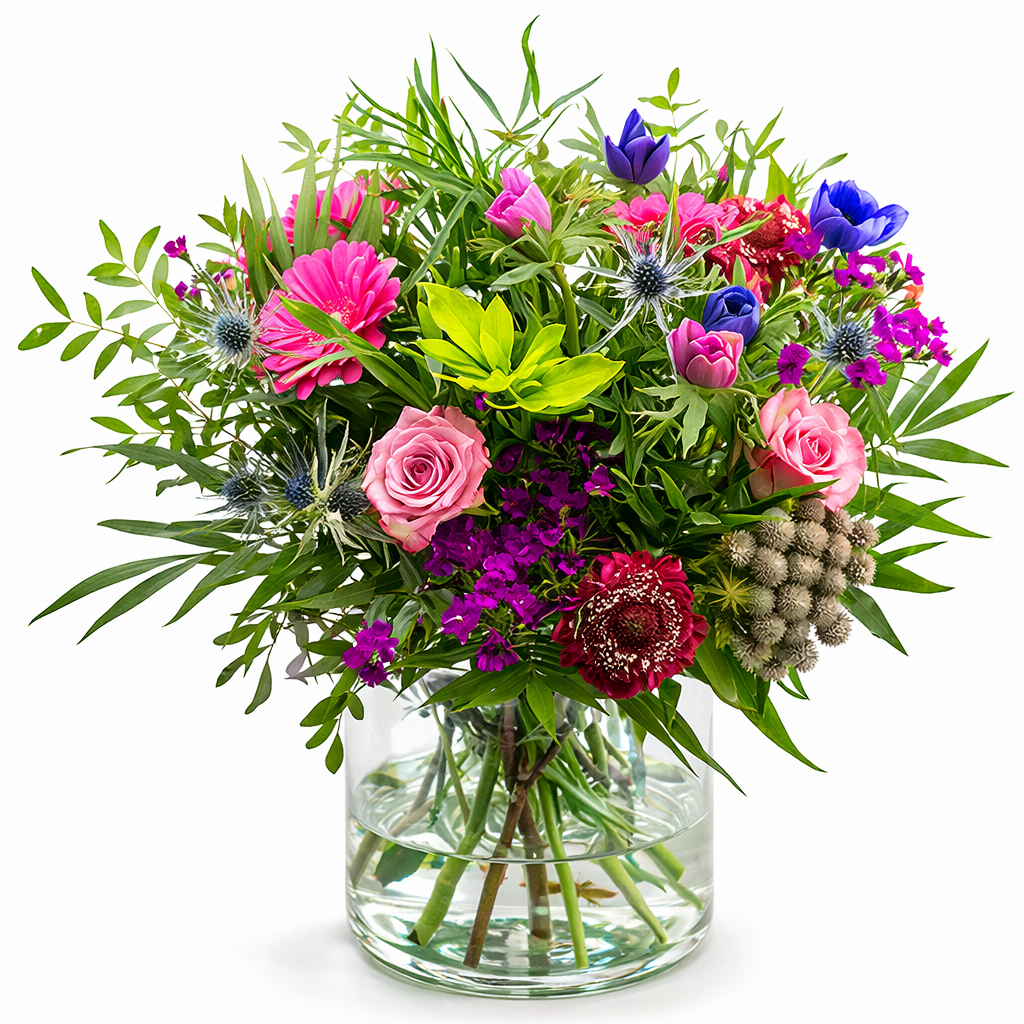 Pak een ruime vaas die goed schoon is, hiermee voorkom je bacteriën in het water en zorg je er voor dat de bloemen niet te krap staan. Vul het water regelmatig bij en ververs het water minimaal één keer.