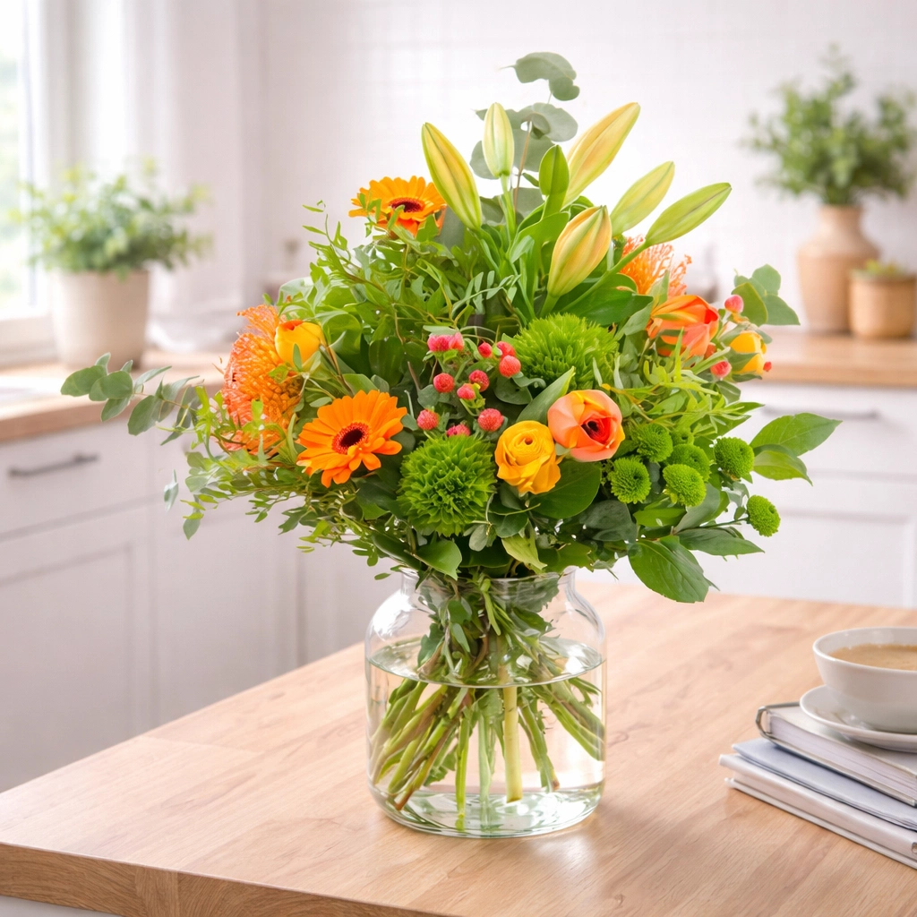 Als je bloemen schuin afsnijd kunnen ze beter water opnemen, zorg ervoor dat er geen blad in het water komt. Voeg de meegeleverde voeding toe aan het water, dan blijft het schoner en de bloemen krijgen voeding.