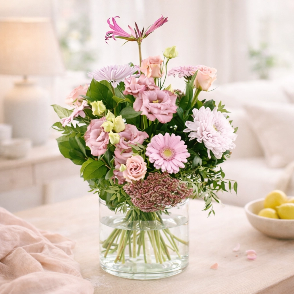 Pak een ruime vaas die goed schoon is, hiermee voorkom je bacteriën in het water en zorg je er voor dat de bloemen niet te krap staan. Vul het water regelmatig bij en ververs het water minimaal één keer.