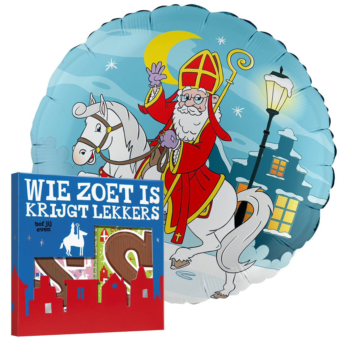 Sinterklaasfeest in een doos. Een heerlijk en feestelijk Sinterklaascadeau! Verras jong of oud met deze vrolijke cadeauset bestaande uit een heliumballon met Sinterklaas en een chocoladeletter in feestverpakking melk pepernoot schuimpjes S en melk spijs speculaas S “Wie zoet is, krijgt lekkers!”. De leukste zwevende verrassing uit een doos!