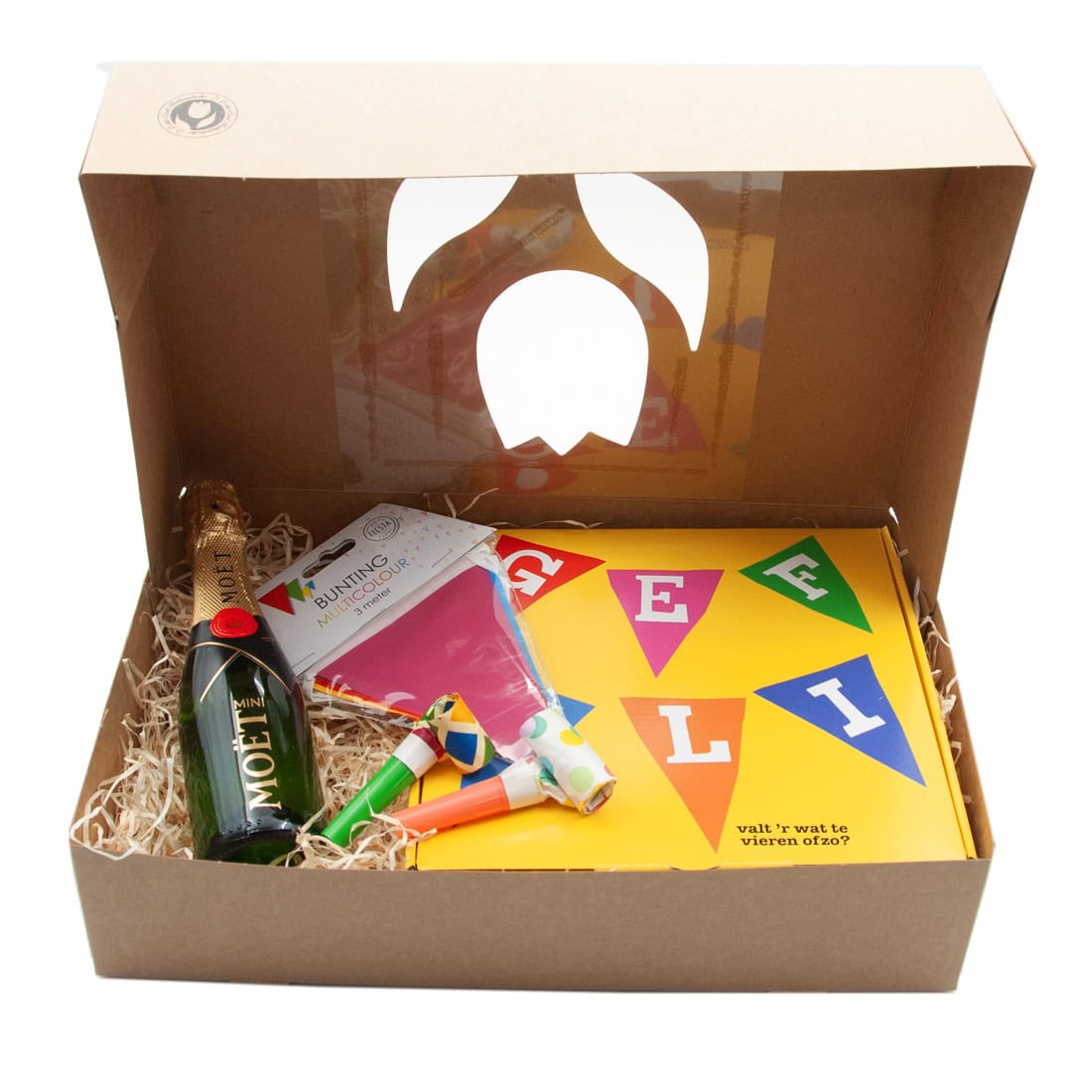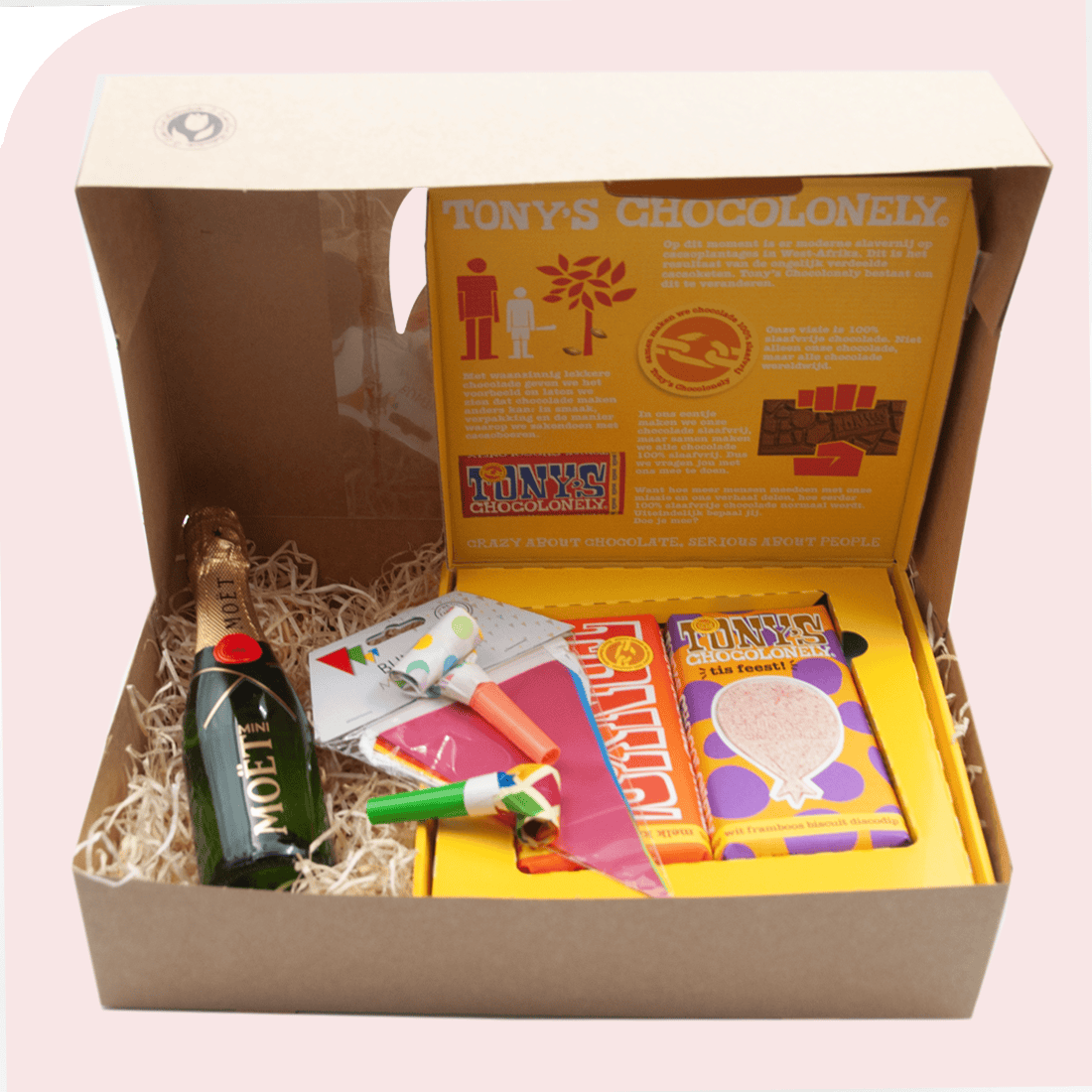 Tonys en Bubbels Cadeaubox. Feestje? Deze sprankelende cadeaubox zegt in één klap: gefeliciteerd! Of het nu gaat om een verjaardag, jubileum, promotie of een ander moment dat gevierd mag worden, met deze vrolijke box zit je altijd goed. Geniet van de rijke smaken van Tony’s Chocolonely in feestelijke smaken, vergezeld door een mini Moët & Chandon champagneflesje. Inclusief feestartikelen zoals toeters en vlaggetjes – direct klaar om iemand te verrassen!