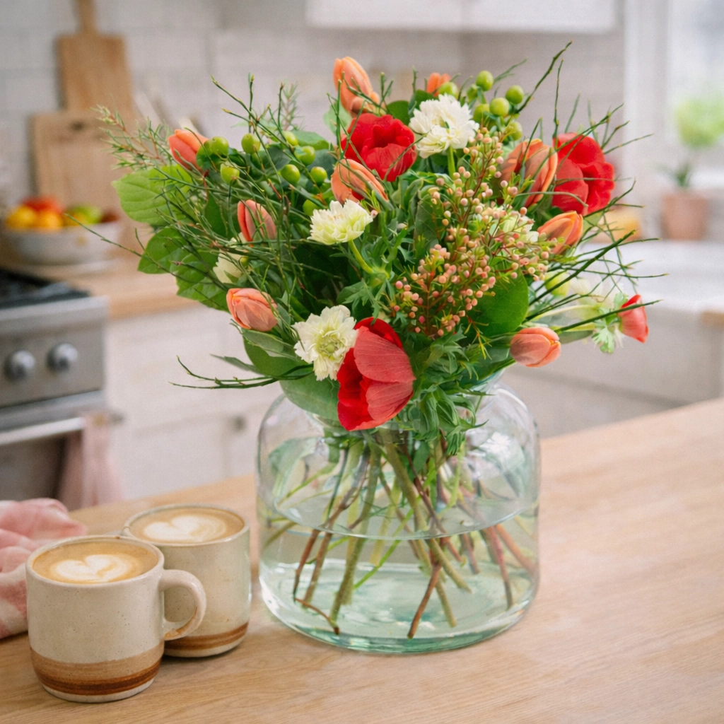 Onze boeketten worden handgebonden door een lokale vak bloemist. Ze kunnen, afhankelijk van het seizoen en beschikbaarheid van de bloemen, enigszins afwijken van de afbeelding. De vaas is niet inbegrepen, maar je kan hem los bijbestellen. (tenzij duidelijk vermeld inclusief vaas)
