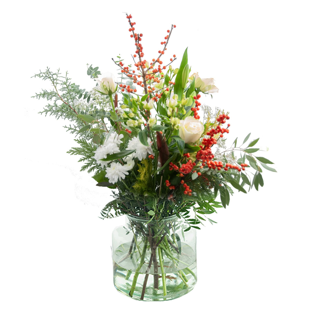 Breng rust én warmte in huis met warm winterwit, een elegant boeket vol witte bloemen, wintergroen en speelse rode besaccenten.
