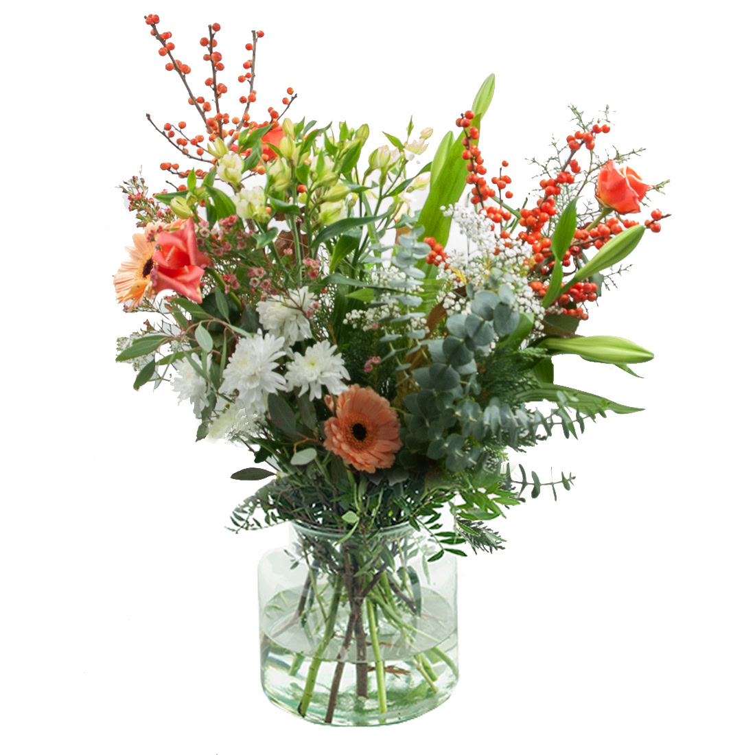 Breng warmte in huis met dit sfeervolle winterboeket in zachte oranje- en wittinten. Een speelse combinatie van seizoensgroen, winterbessen en frisse bloemen zorgt voor een elegante, winterse uitstraling.