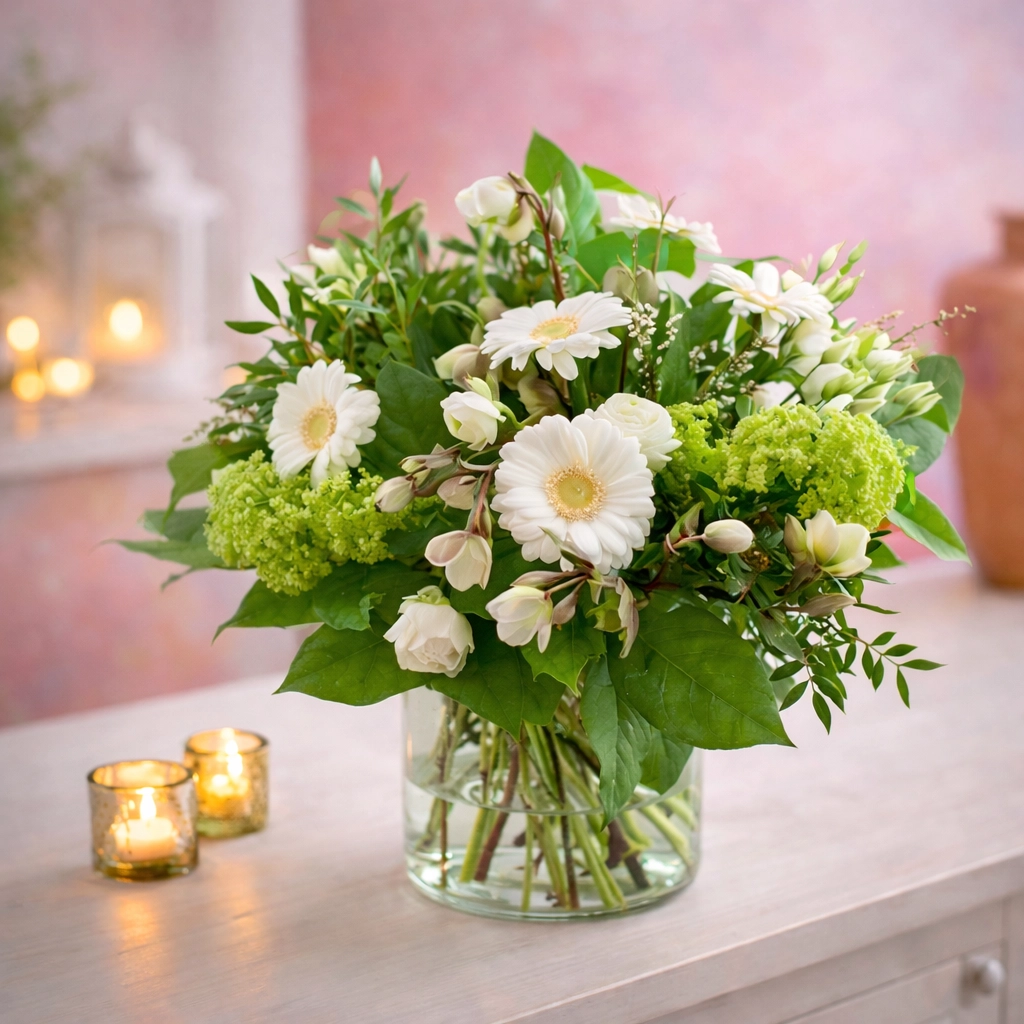 Onze boeketten worden handgebonden door een lokale vak bloemist. Ze kunnen, afhankelijk van het seizoen en beschikbaarheid van de bloemen, enigszins afwijken van de afbeelding. De vaas is niet inbegrepen, maar je kan hem los bijbestellen. (tenzij duidelijk vermeld inclusief vaas)